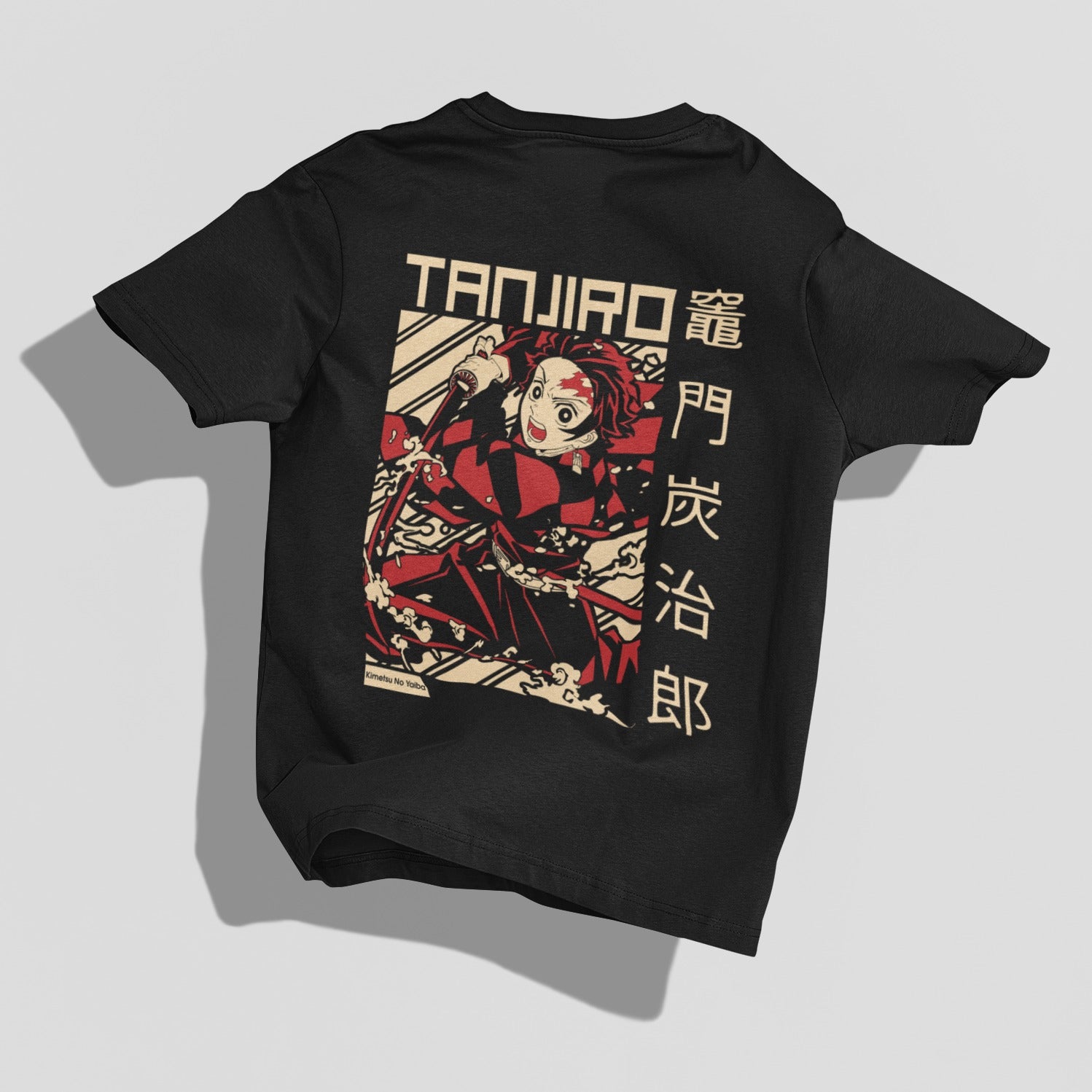Crafted from premium black cotton, the oversized silhouette adds an extra layer of casual coolness. Tanjiro's presence, bold and dynamic, dominates the back design, while "TANJIRO" stands out in bold English letters. Dive deeper into the Japanese aesthetic with "Kamado Tanjiro" written in Japanese characters, and the anime's title, "Kimetsu No Yaiba," boldly declared at the bottom.