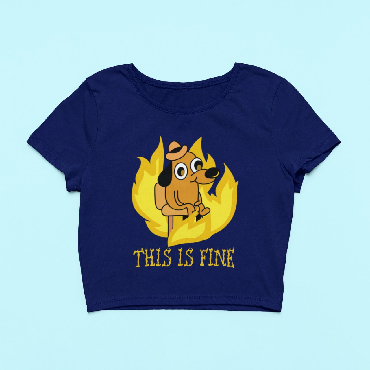Introducing our "This Is Fine" meme dog crop top, now available in sleek navy blue. This playful design features the iconic "This Is Fine" dog sipping coffee amidst chaos, blending comfort and humor seamlessly. Crafted with care and style in mind, this crop top is a delightful addition to your wardrobe, perfect for sunny days or when you want a fun and stylish touch to your outfit.