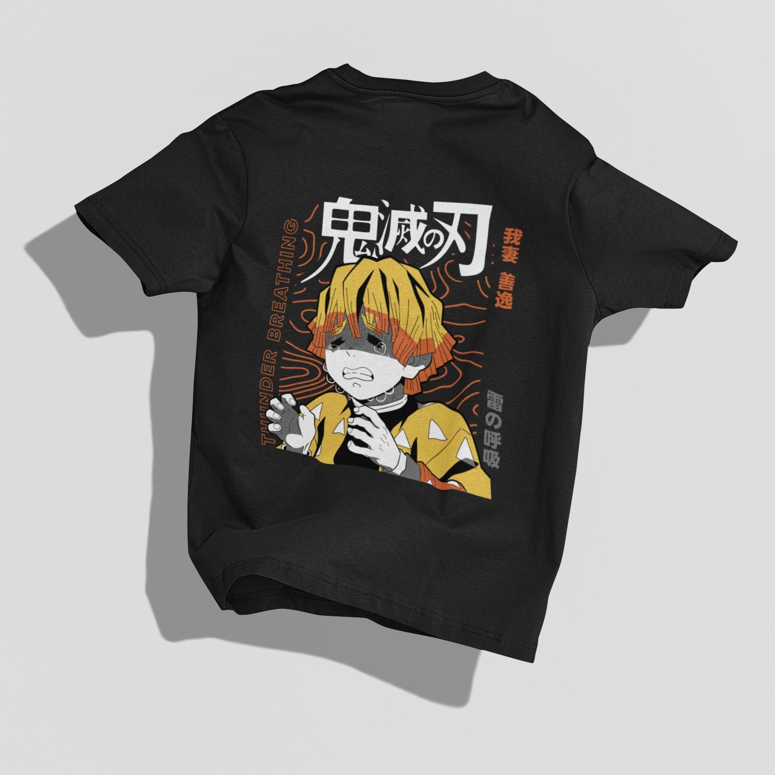 In a bold statement, "Thunder Breathing" is written in eye-catching bold letters, emphasizing Zenitsu's formidable skills. The Japanese characters for "Demon Slayer" add an extra layer of authenticity to the design, grounding it in the captivating universe of demon-slaying adventures.