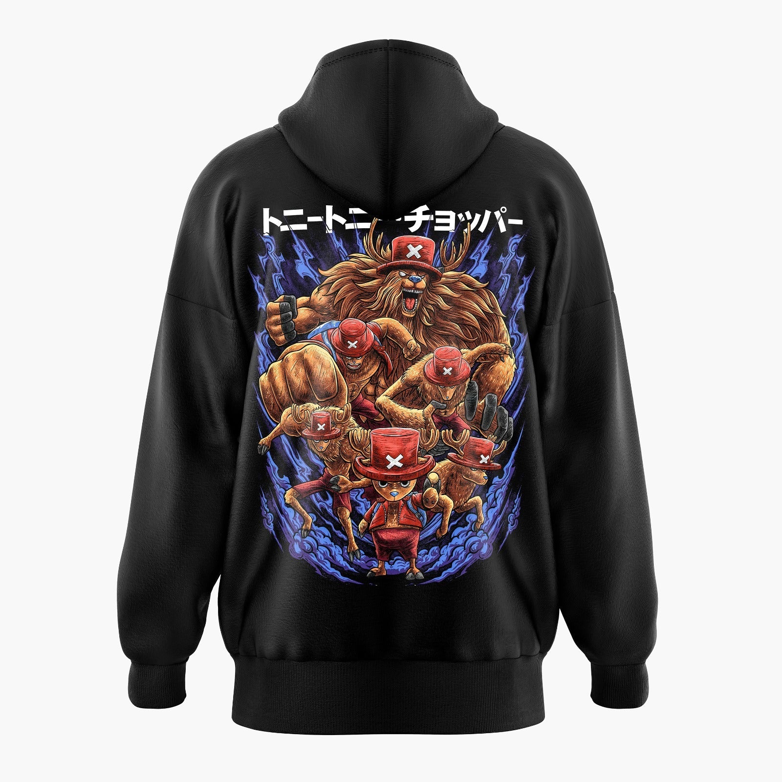 Embark on an adventure with our exclusive Tony Tony Chopper Premium Oversized Hoodie, a tribute to the adorable reindeer who transforms into a powerhouse with his Rumble Ball. The captivating design features Chopper holding the Rumble Ball, surrounded by the dynamic manifestations of his various forms – Monster Point, Jumping Point, Arm Point, Heavy Point, and Brain Point. "Tony Tony Chopper" is elegantly inscribed in Japanese characters at the top, adding cultural flair to this whimsical and powerful design.