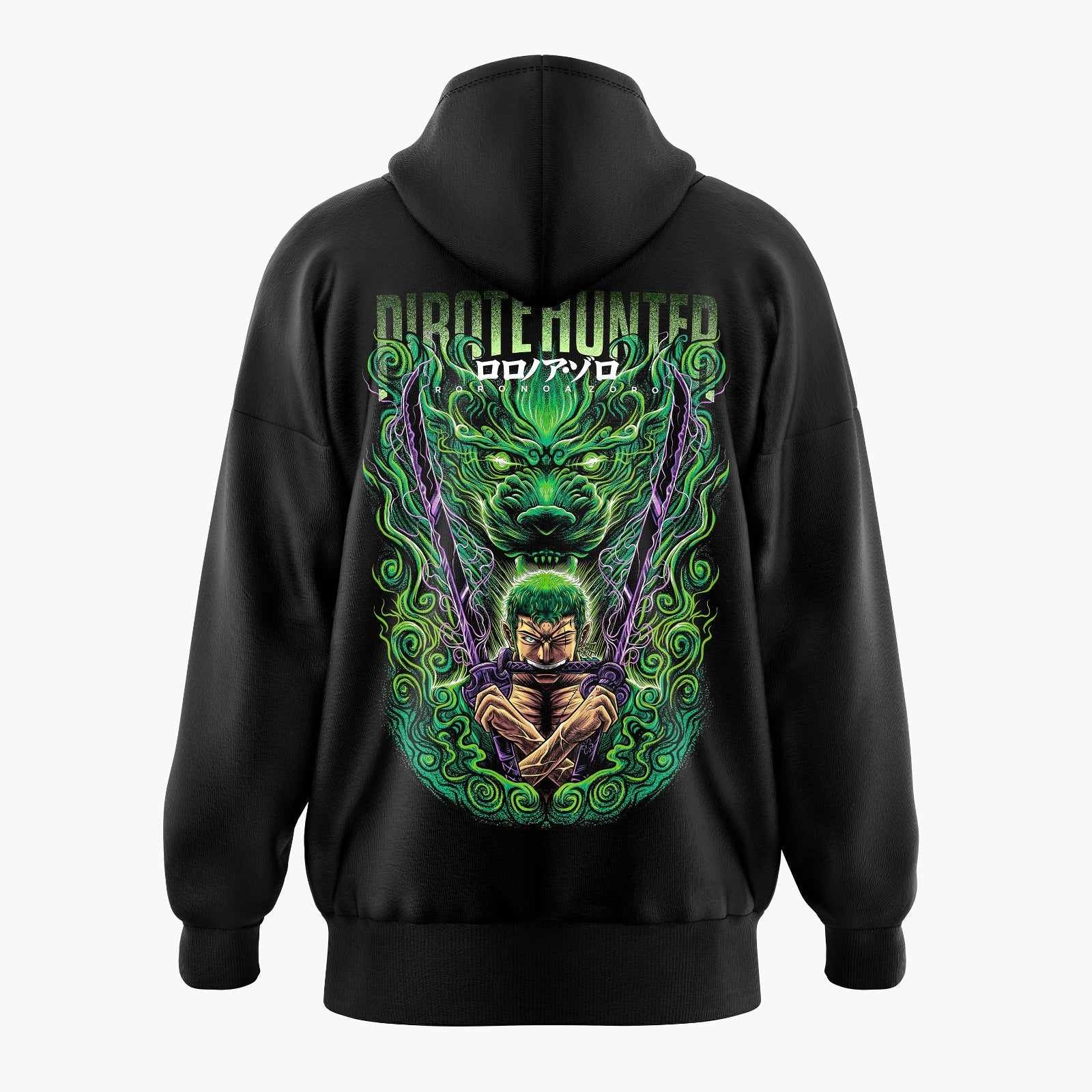 Embark on an epic journey with our Roronoa Zoro Oversized Hoodie, a visual testament to the mastery of the Pirate Hunter. The back design showcases Zoro in the midst of his ultra Tiger Hunt attack, wielding all three swords with unparalleled precision. A colossal green tiger's face lurks ominously in the background, creating a garment that goes beyond clothing, telling a story of swordsmanship and strength. "Pirate Hunter" boldly adorns the top in vivid green, while "Roronoa Zoro" is elegantly written in Japanese characters, encapsulating the essence of this iconic character.