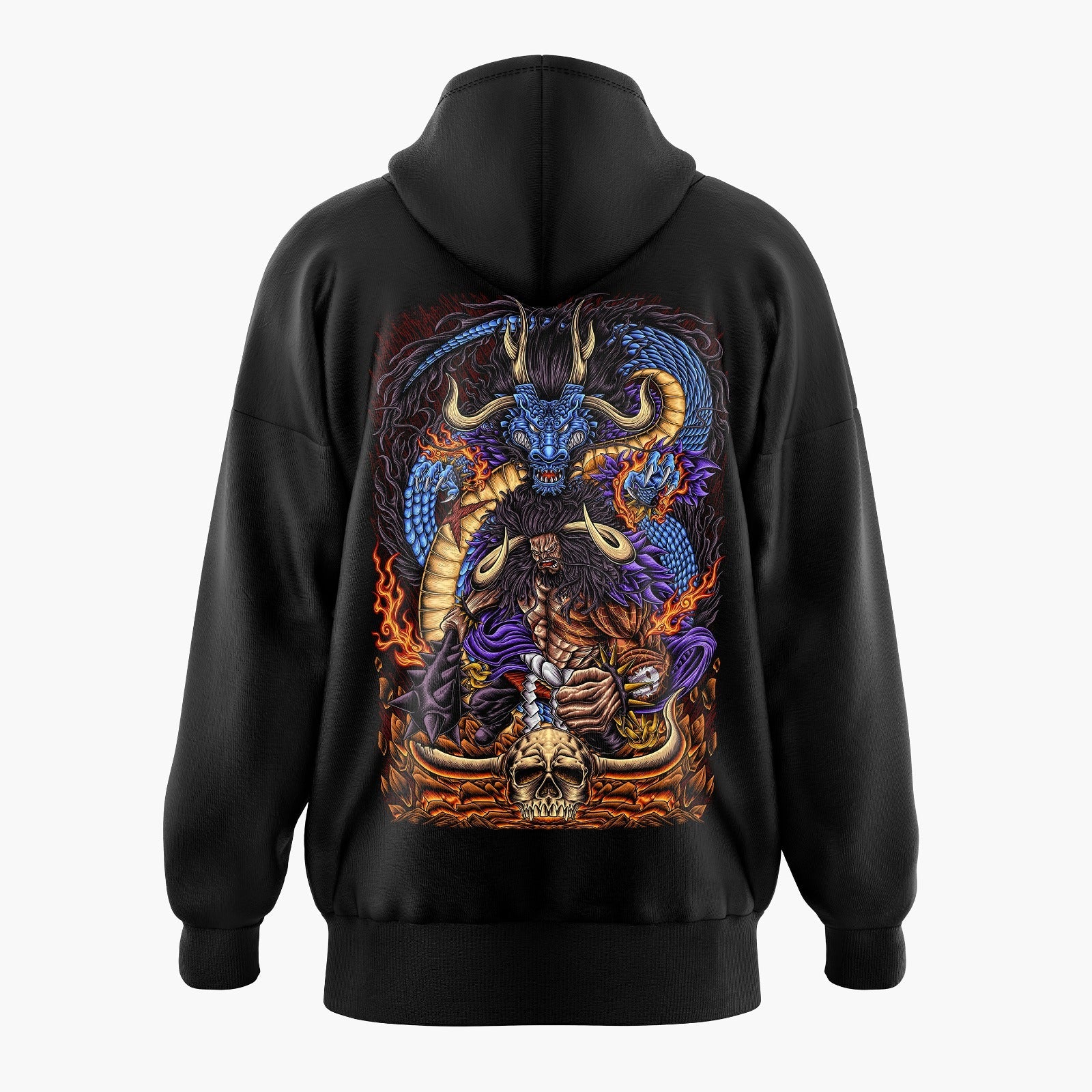 This hoodie isn't just an article of clothing; it's a wearable masterpiece celebrating the awe-inspiring presence of Kaido's Azure Dragon. The dynamic composition, dark hues, and bold design elements offer a unique expression of your love for anime and streetwear.