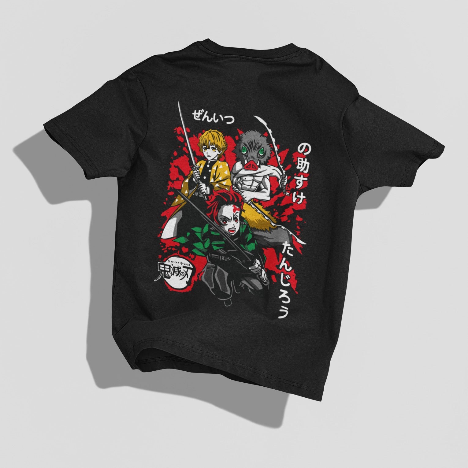 As Zenitsu, Tanjiro, and Inosuke stand side by side, their names boldly written in Japanese characters, the design exudes an edgy and dynamic vibe. In the foreground, the series title "Kimetsu no Yaiba" adds an extra layer of coolness, grounding the design in the intense and mythical world of demon-slaying adventures.
